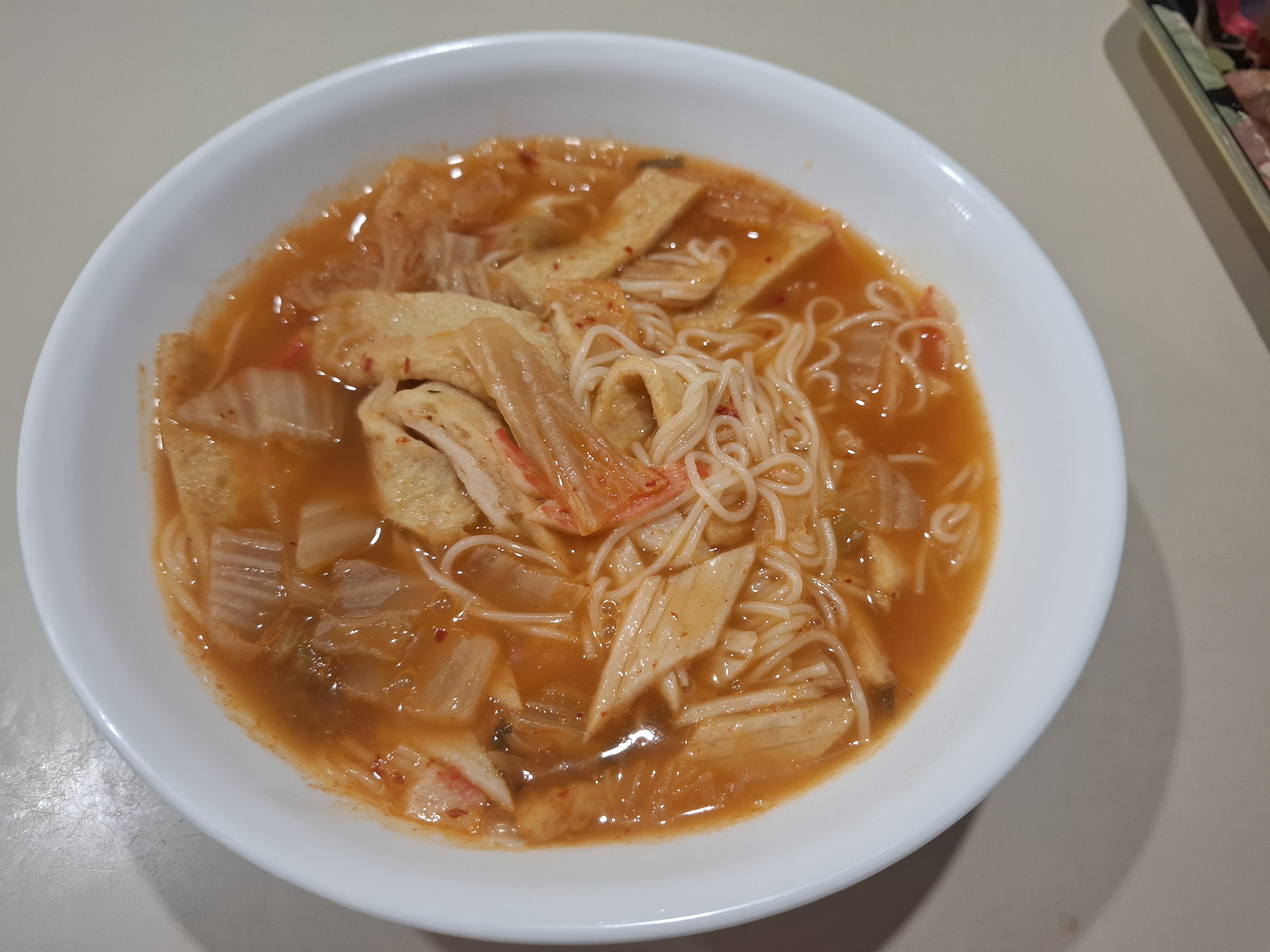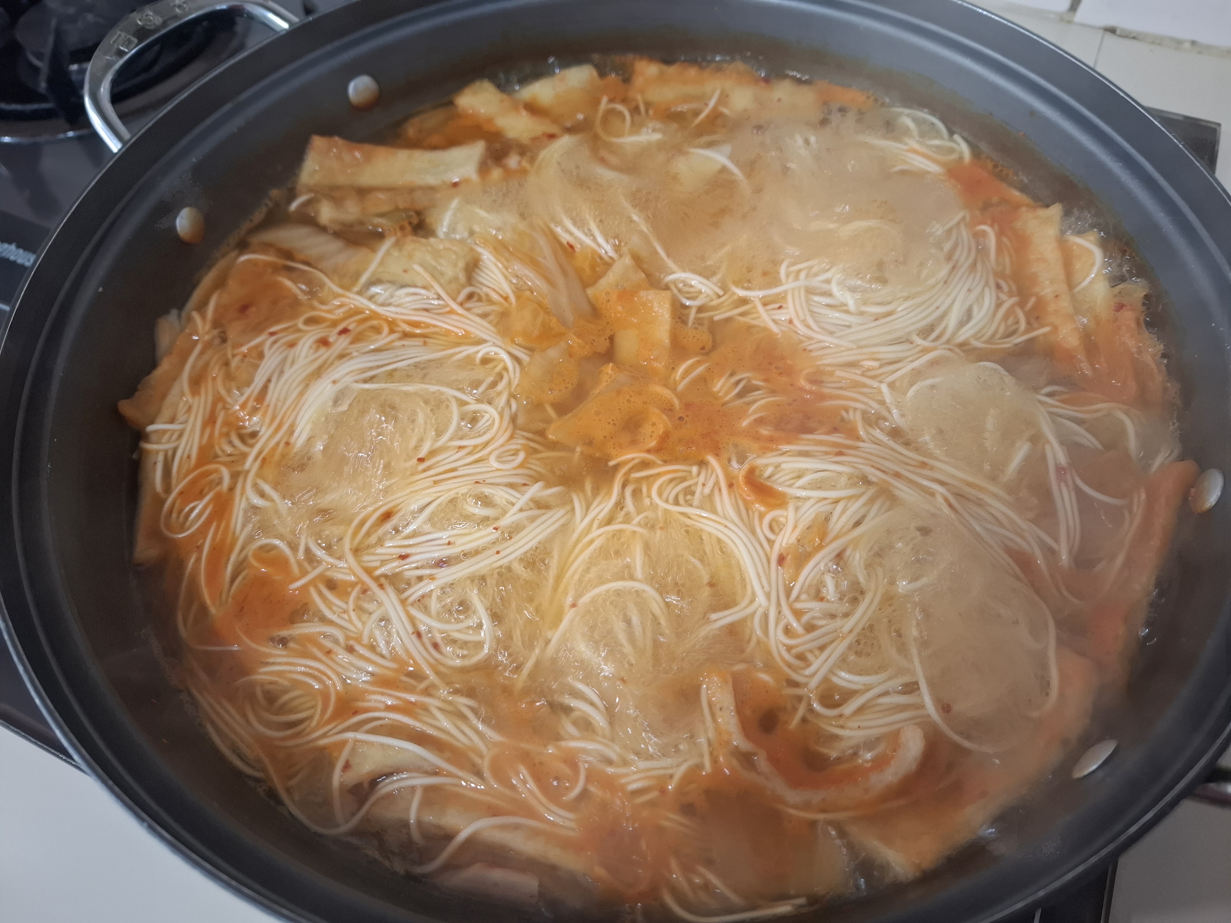 나는 오후 1시 55분에 미리 해두었던 김치국물에 국수를 넣었다.