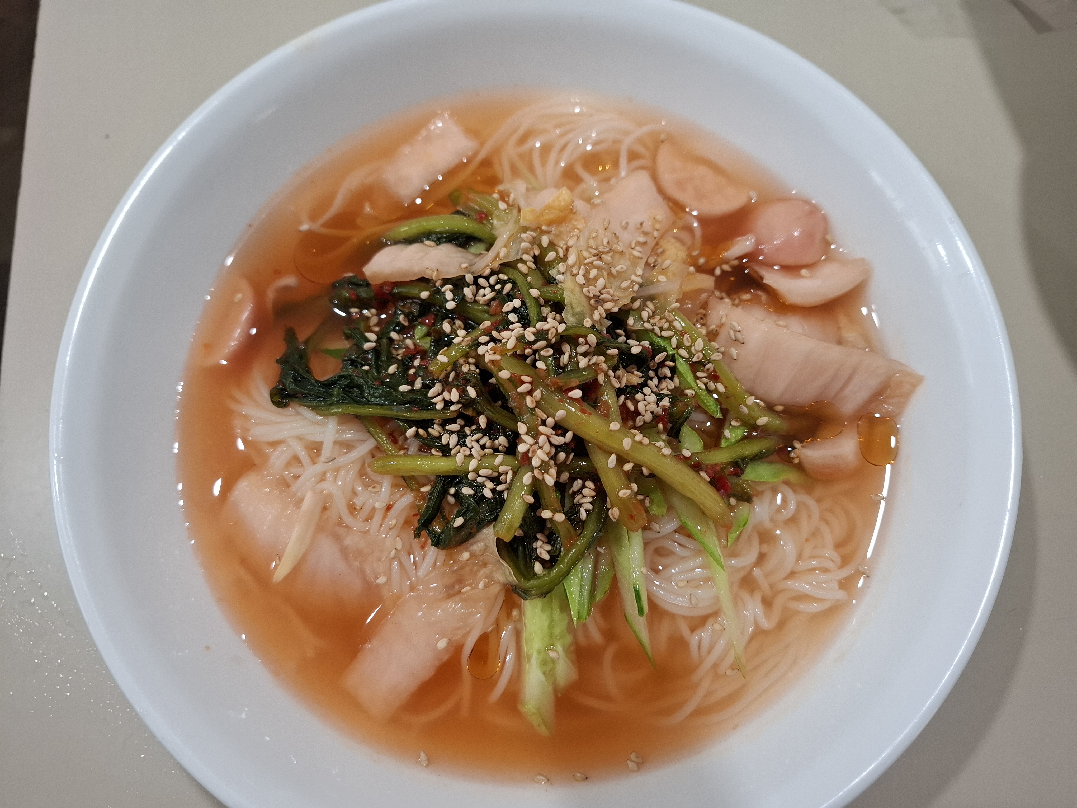 집에 와서 점심으로 국수를 삶아 물김치 국물을 넣고 오이채와 열무김치를 얹어서 먹었다.