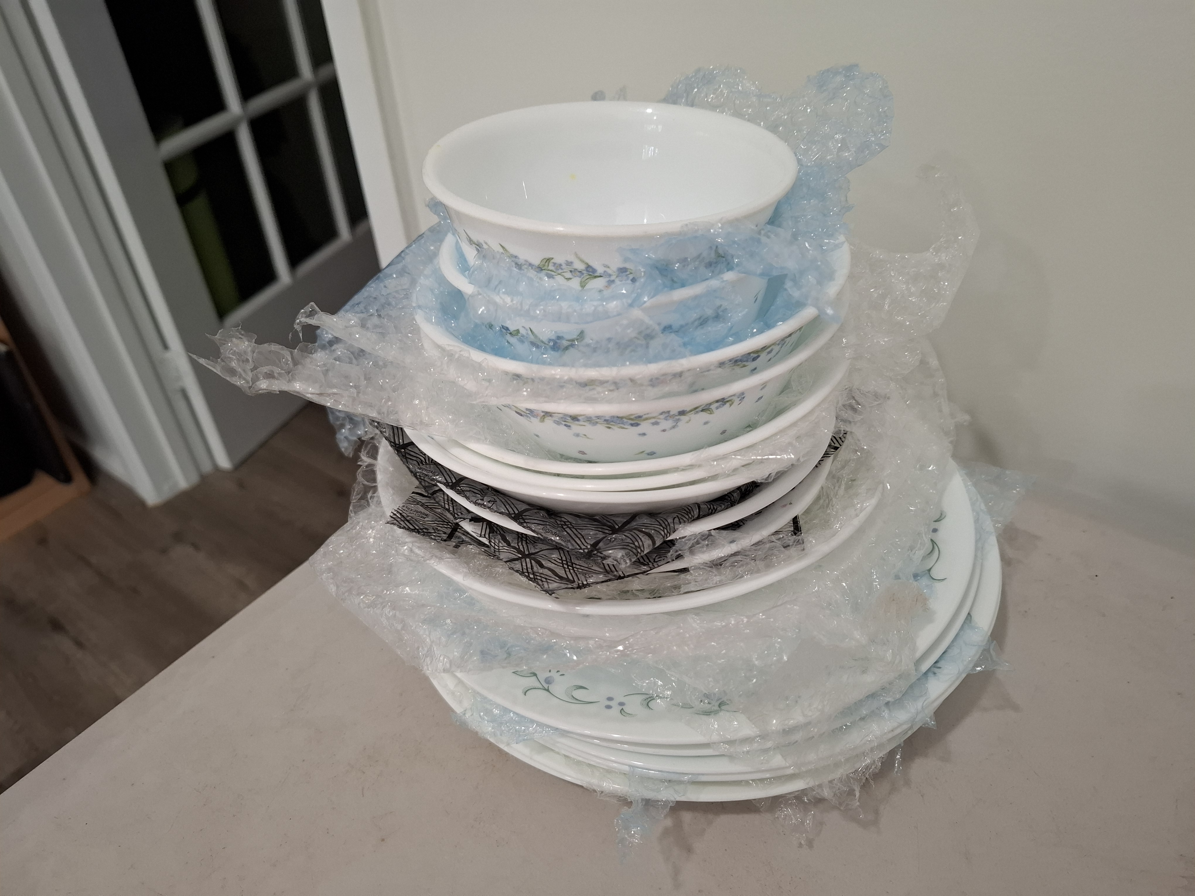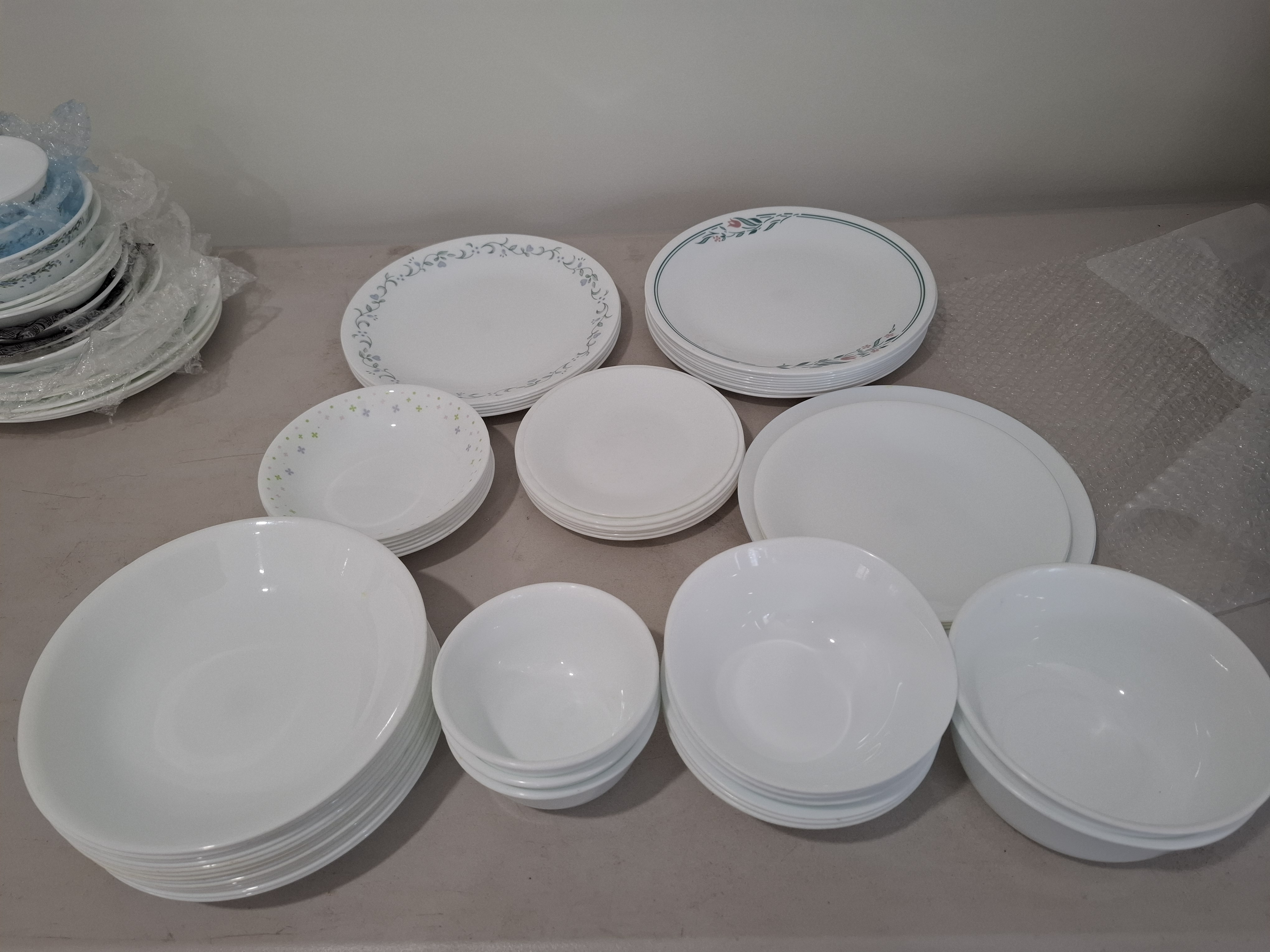 내가 돈 주고 산 그릇들이다. 큰 접시만 빼놓고 나머지는 무늬가 없는 코닝 그릇들이다.