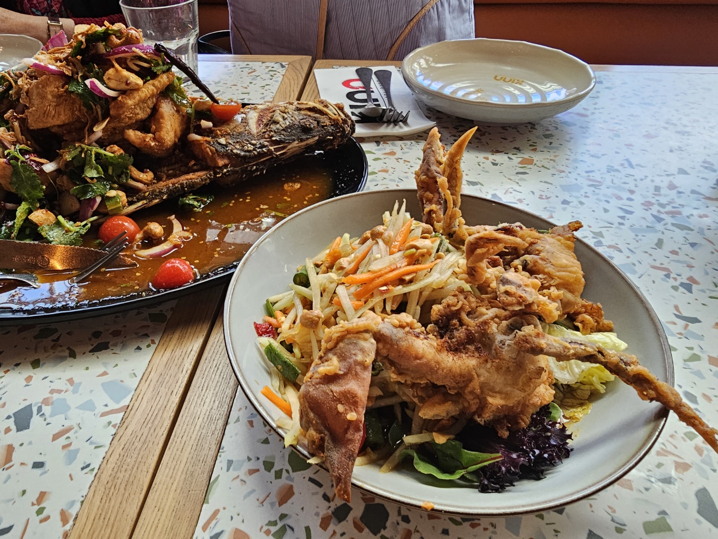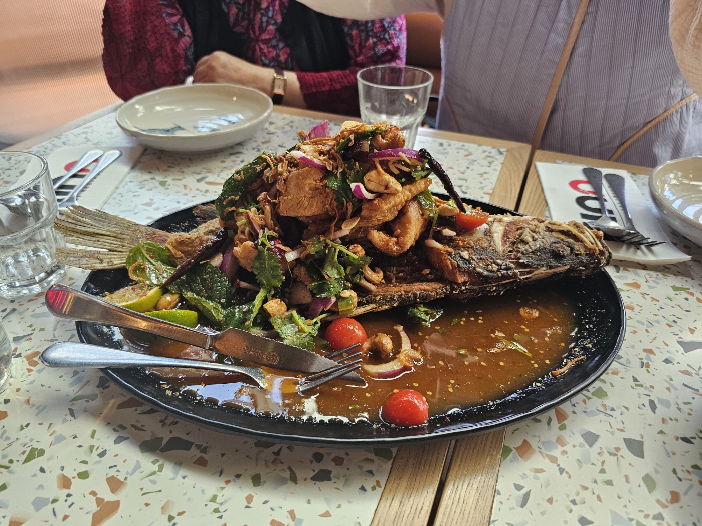 메뉴는 생선 1마리 튀긴 것, 돼지갈비찜, 파파야샐러드, 볶음밥, 흰밥 한 공기.