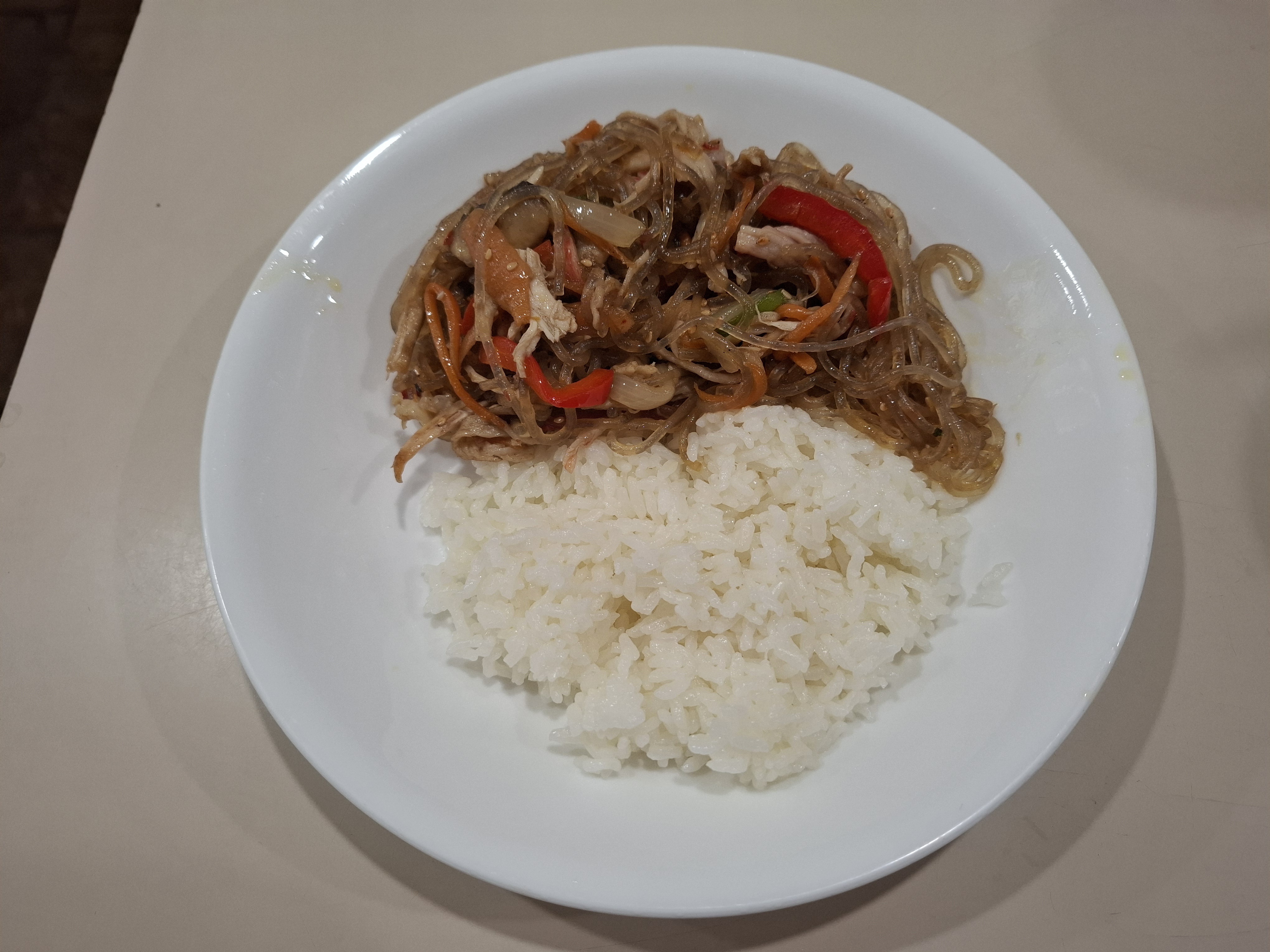 저녁에는 밥과 잡채를 큰 접시에 담았다. 간이 살짝 약한 것은 양념장을 얹어먹으면 된다. 남편을 위한 김치찌개도 했다.