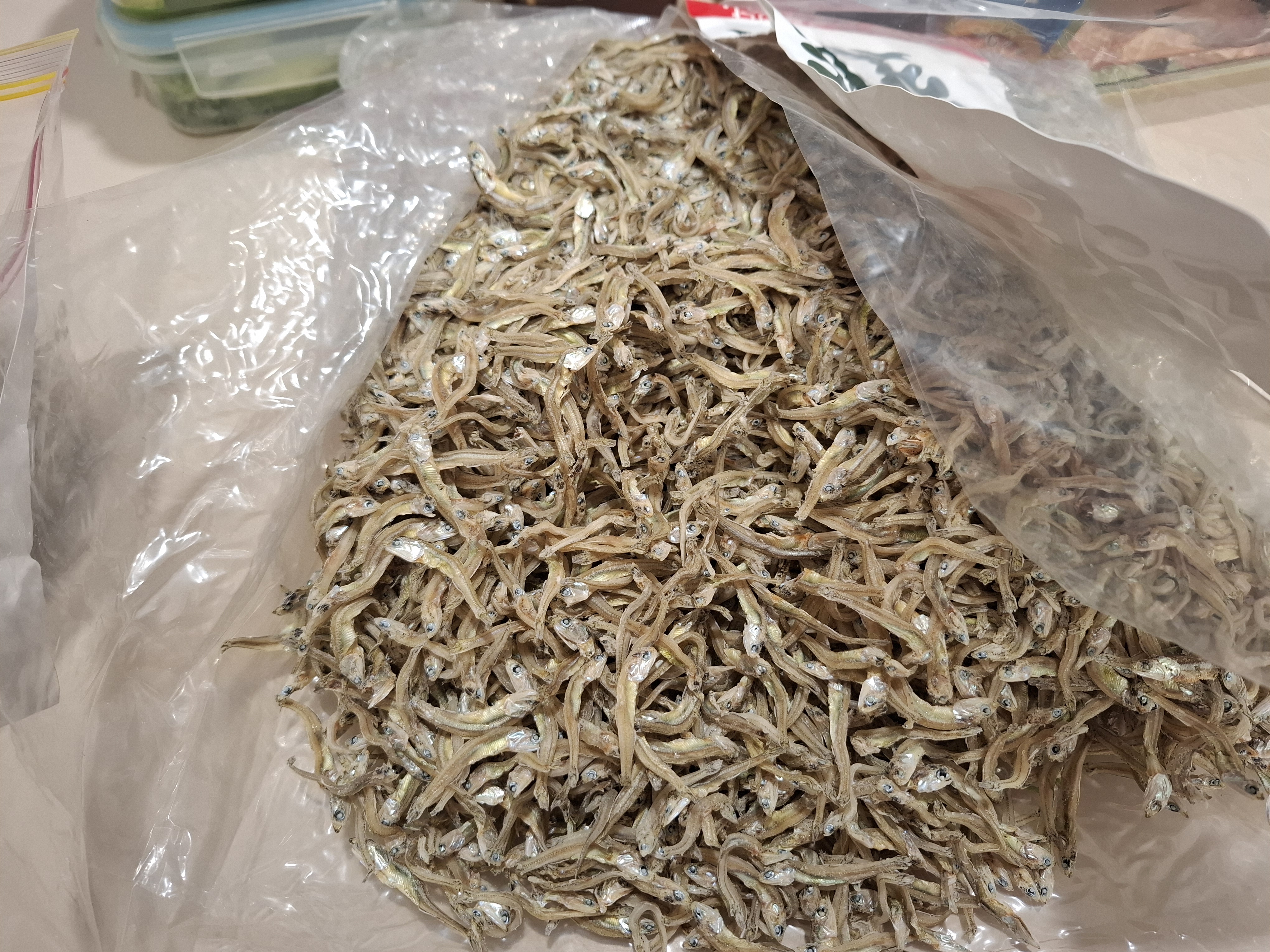 멸치는 2킬로짜리를 압축백에 넣었는데 이것을 200그램씩 나누었다.