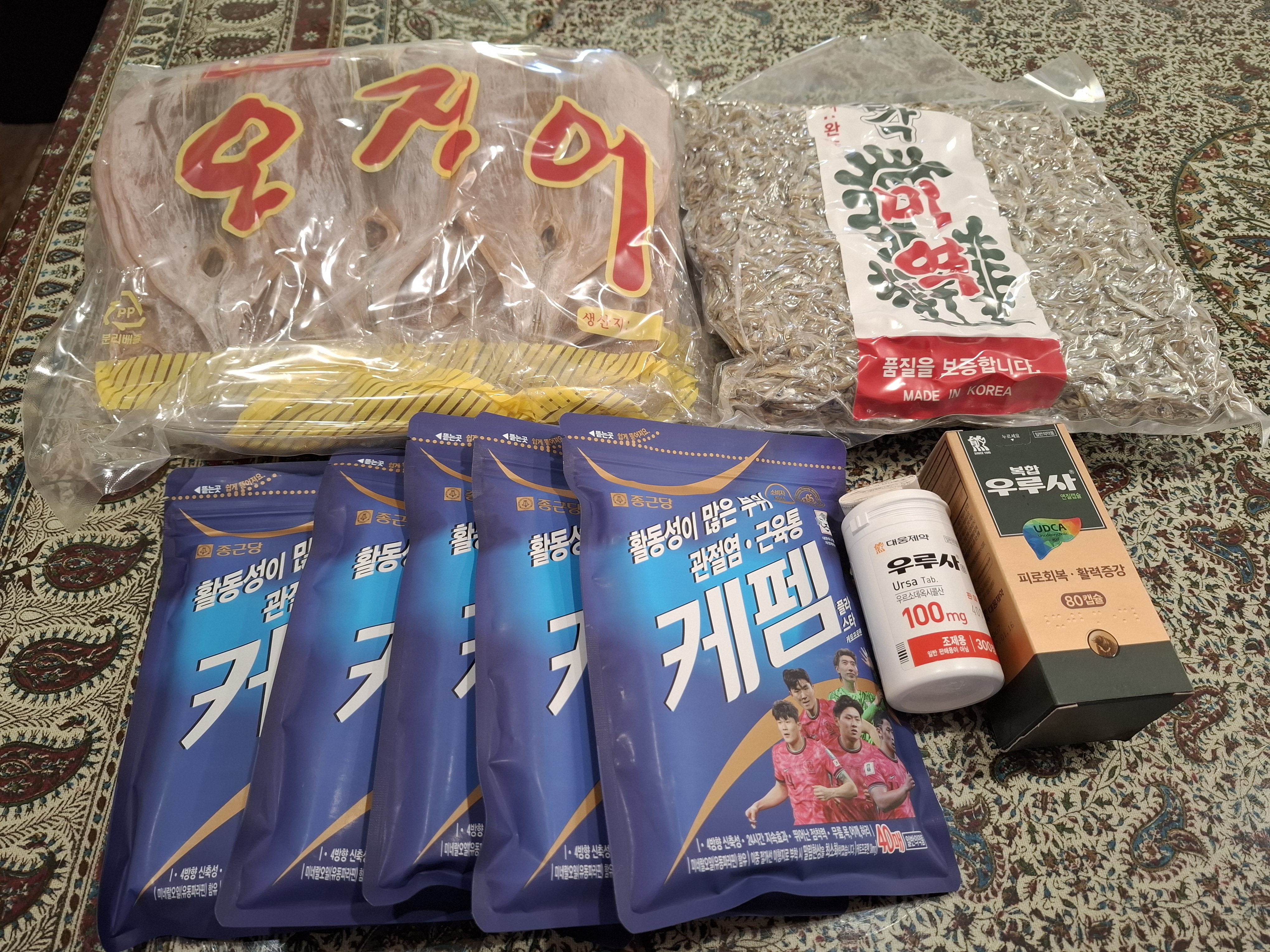 안의 내용물은 오징어, 멸치, 파스, 우루사다.