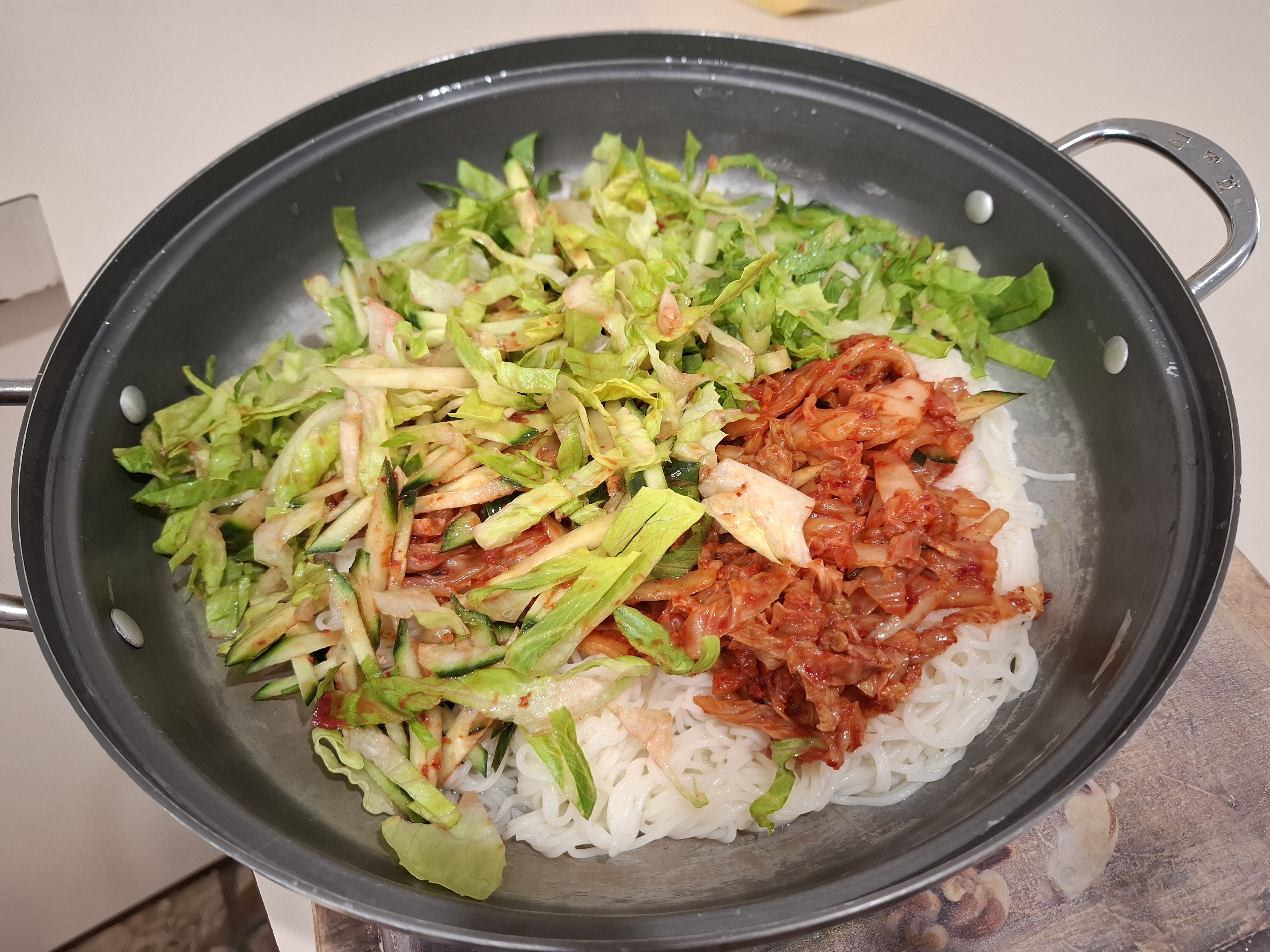 오늘 점심은 남편이 좋아하는 비빔국수를 해주었다. 신김치, 오이채, 상추를 송송 썰고 고추장, 참기름, 간장, 깨, 설탕등 양념을 넣고 무쳐낸다. 비빔국수라고 해도 국물이 자작하게 있어야 하니 냉면육수를 넣어준다.